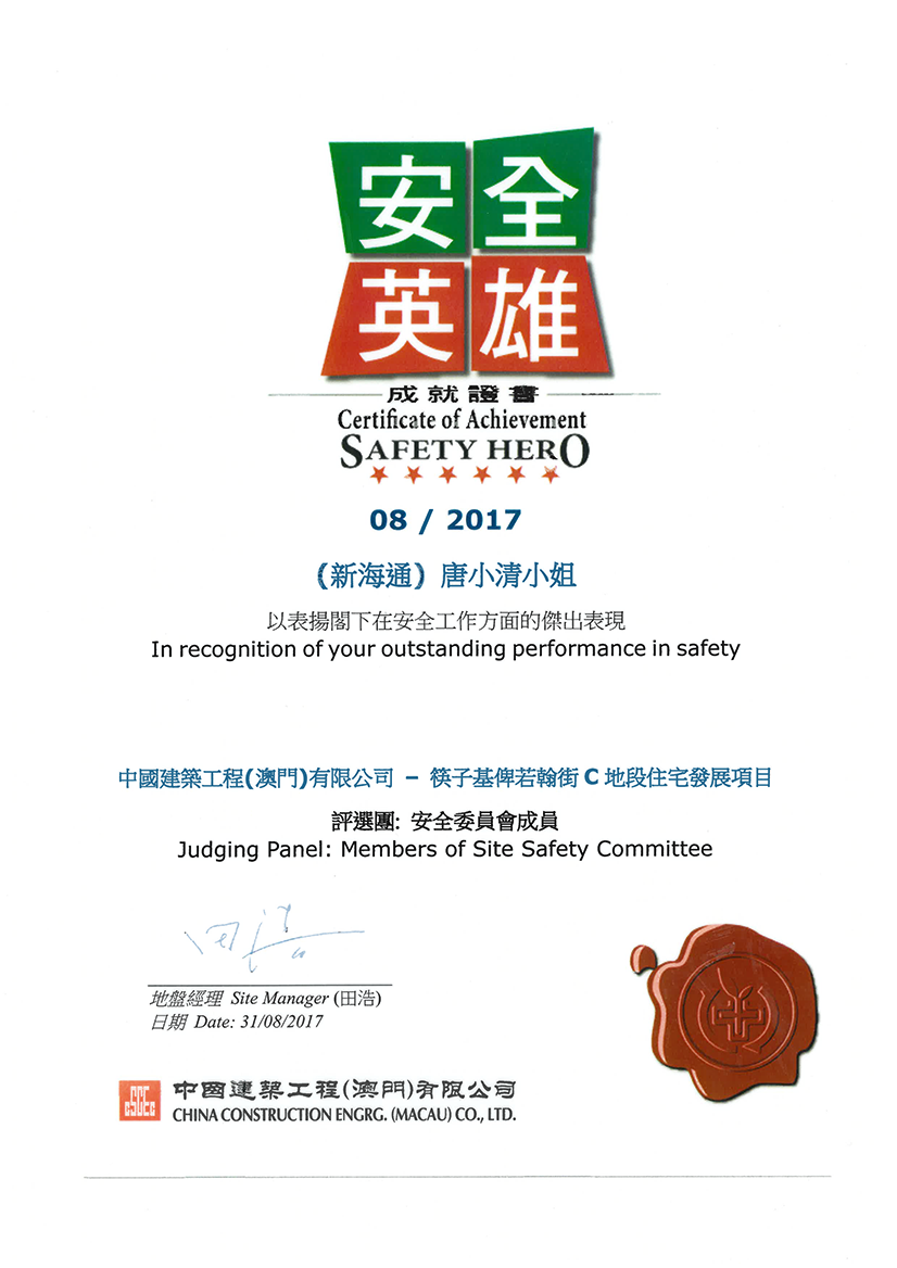 就此《中國建築工程(澳門)有限公司》為我們辛勞的技術工人頒布了《安全英雄成就證書》以示表揚。