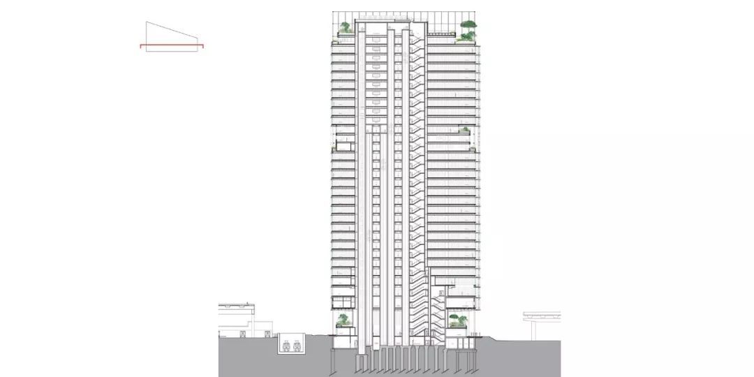 外牆構架從底延伸到頂部,将屋頂的設備圍合起來,形成一個有框架感的整體。